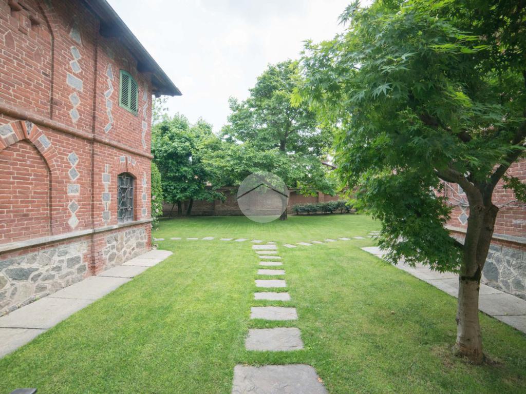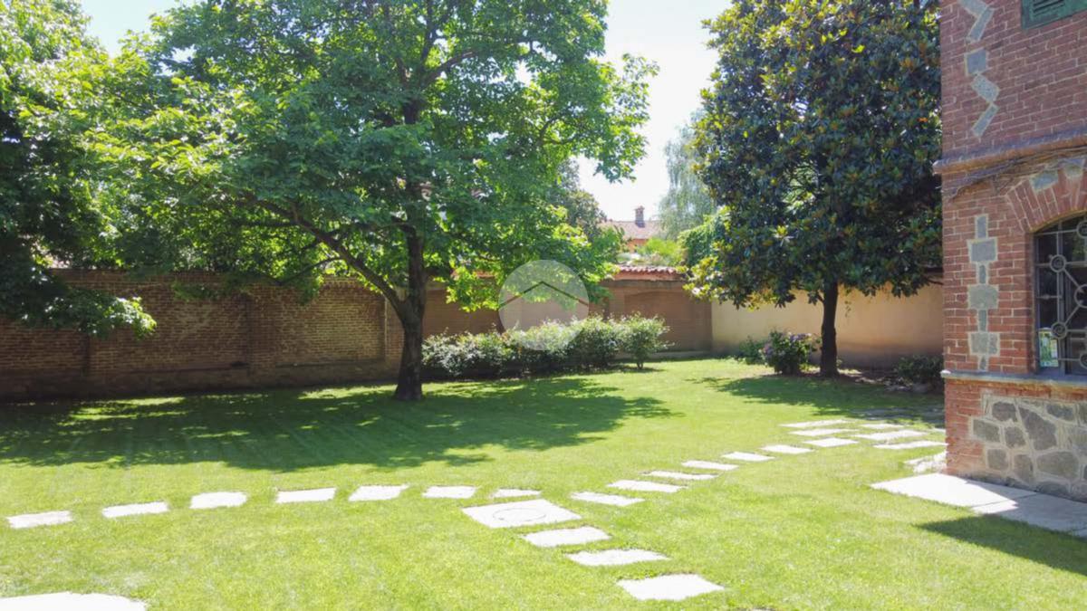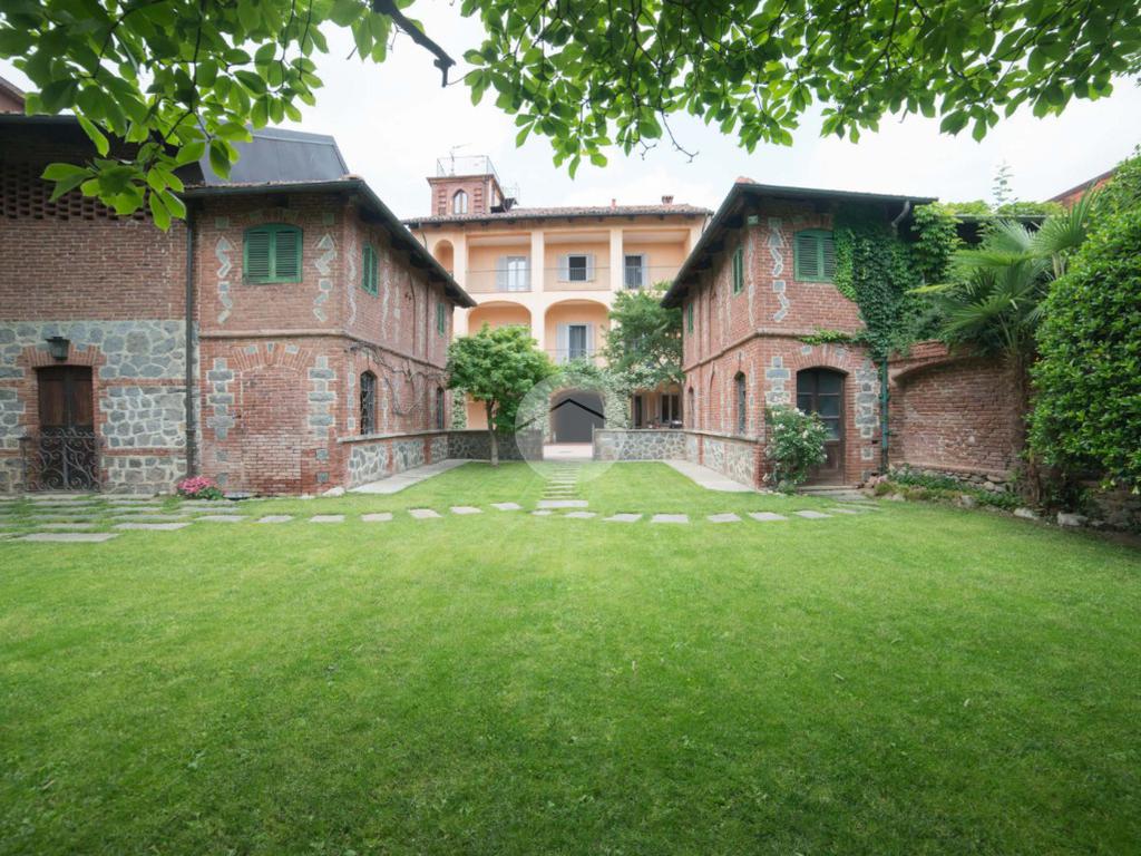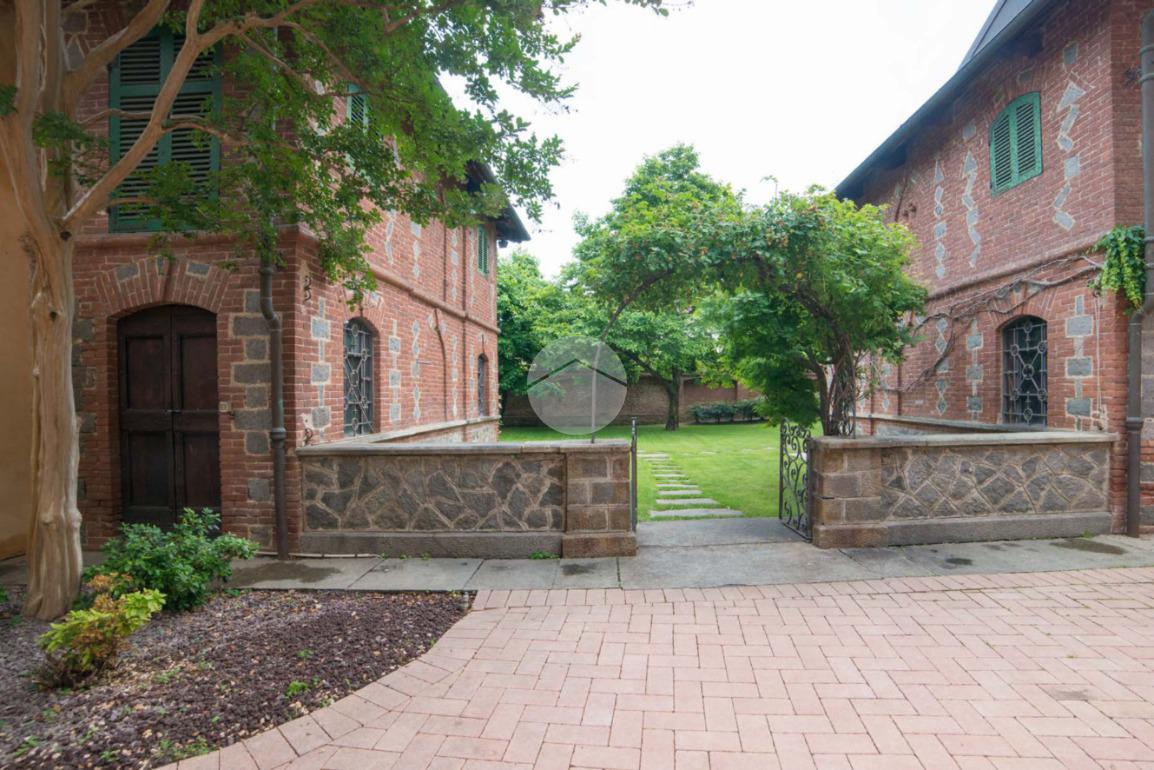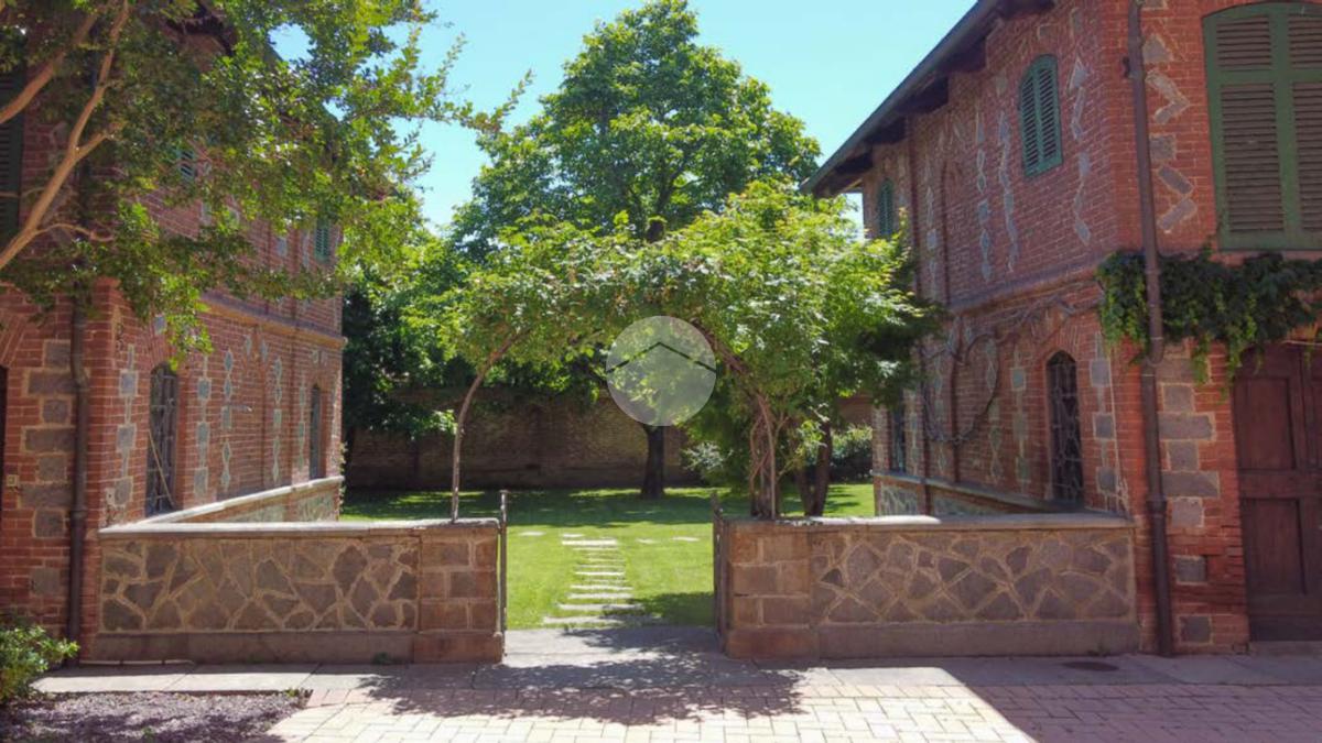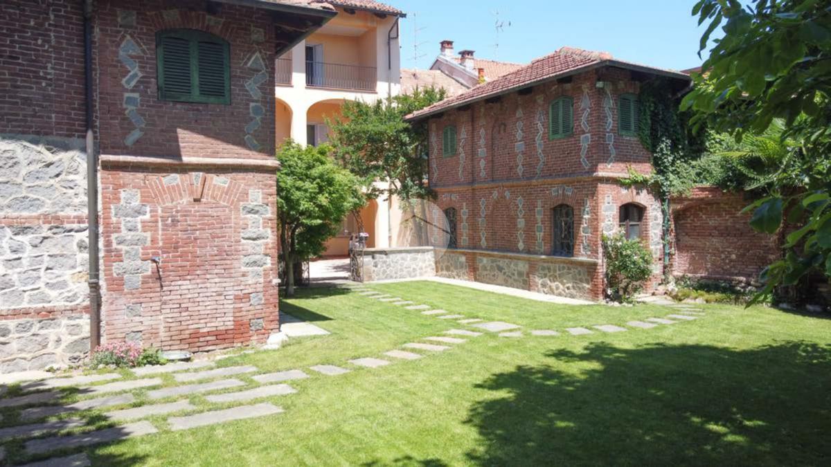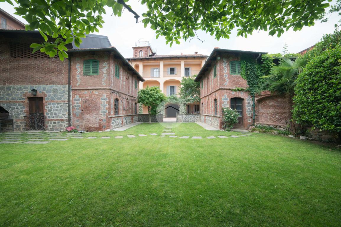 La proprietà si sviluppa attorno a un giardino centrale curato e piantumato, impreziosito da camminamenti in pietra e incorniciato da due corpi laterali in mattoni a vista con inserti lapidei e zoccolatura in pietra, tipici dell’architettura piemontese storica. Il prospetto principale, intonacato in tonalità calda, è valorizzato da un loggiato ad archi e da una balconata con ringhiera in ferro che conferiscono armonia ed equilibrio alla facciata. La torretta in laterizio, ben visibile dall’esterno, completa l’insieme architettonico e dona alla proprietà un tratto distintivo di rara suggestione.