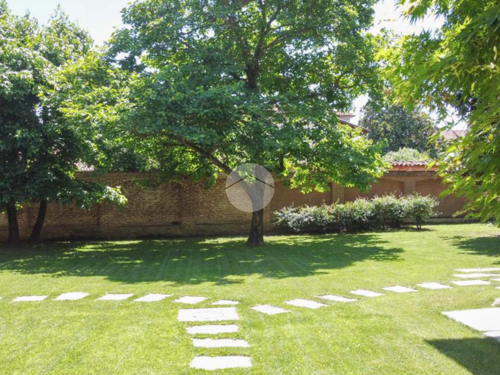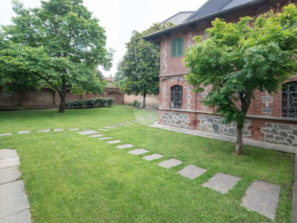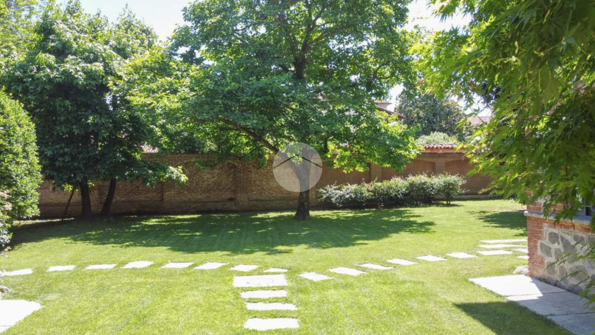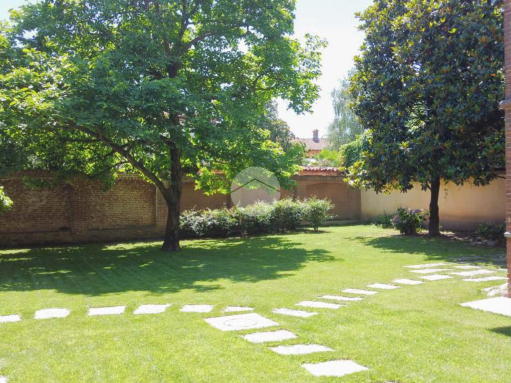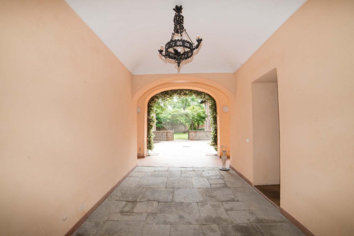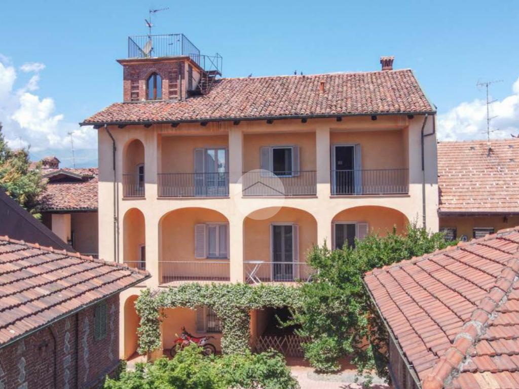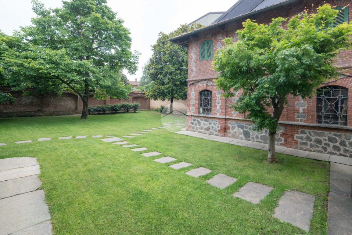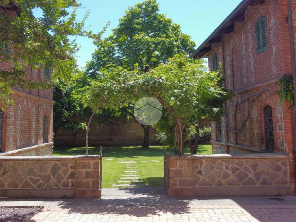 La proprietà si sviluppa attorno a un giardino centrale curato e piantumato, impreziosito da camminamenti in pietra e incorniciato da due corpi laterali in mattoni a vista con inserti lapidei e zoccolatura in pietra, tipici dell’architettura piemontese storica. Il prospetto principale, intonacato in tonalità calda, è valorizzato da un loggiato ad archi e da una balconata con ringhiera in ferro che conferiscono armonia ed equilibrio alla facciata. La torretta in laterizio, ben visibile dall’esterno, completa l’insieme architettonico e dona alla proprietà un tratto distintivo di rara suggestione.